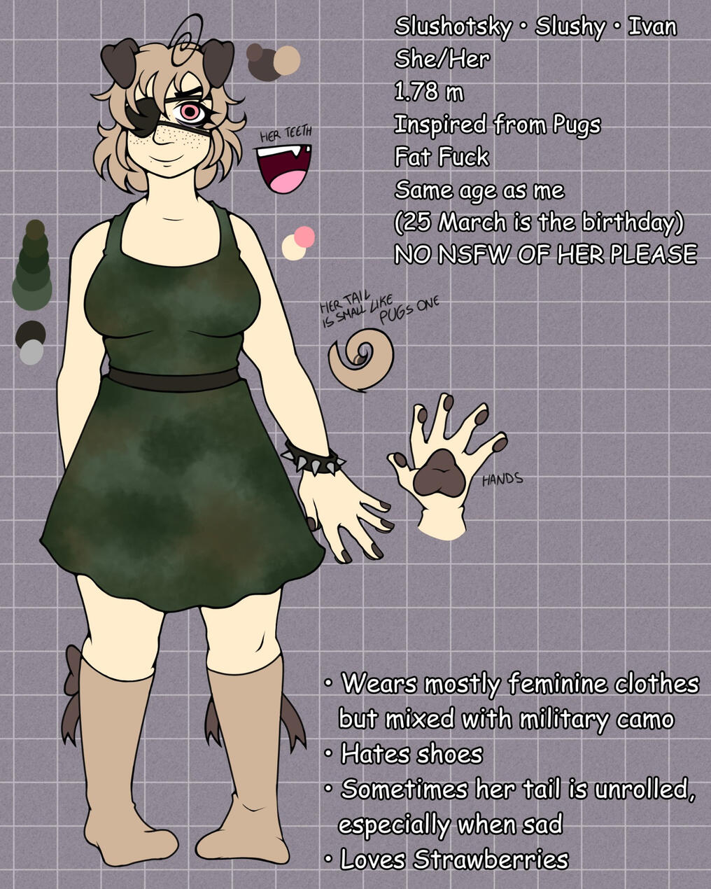 This is the character I use to represent myself, she represents the fact that I LOVE pugs. She hasn't a specific lore (because I'm a very indecisive person), but she's always a sort of mutation and not something totally human.
