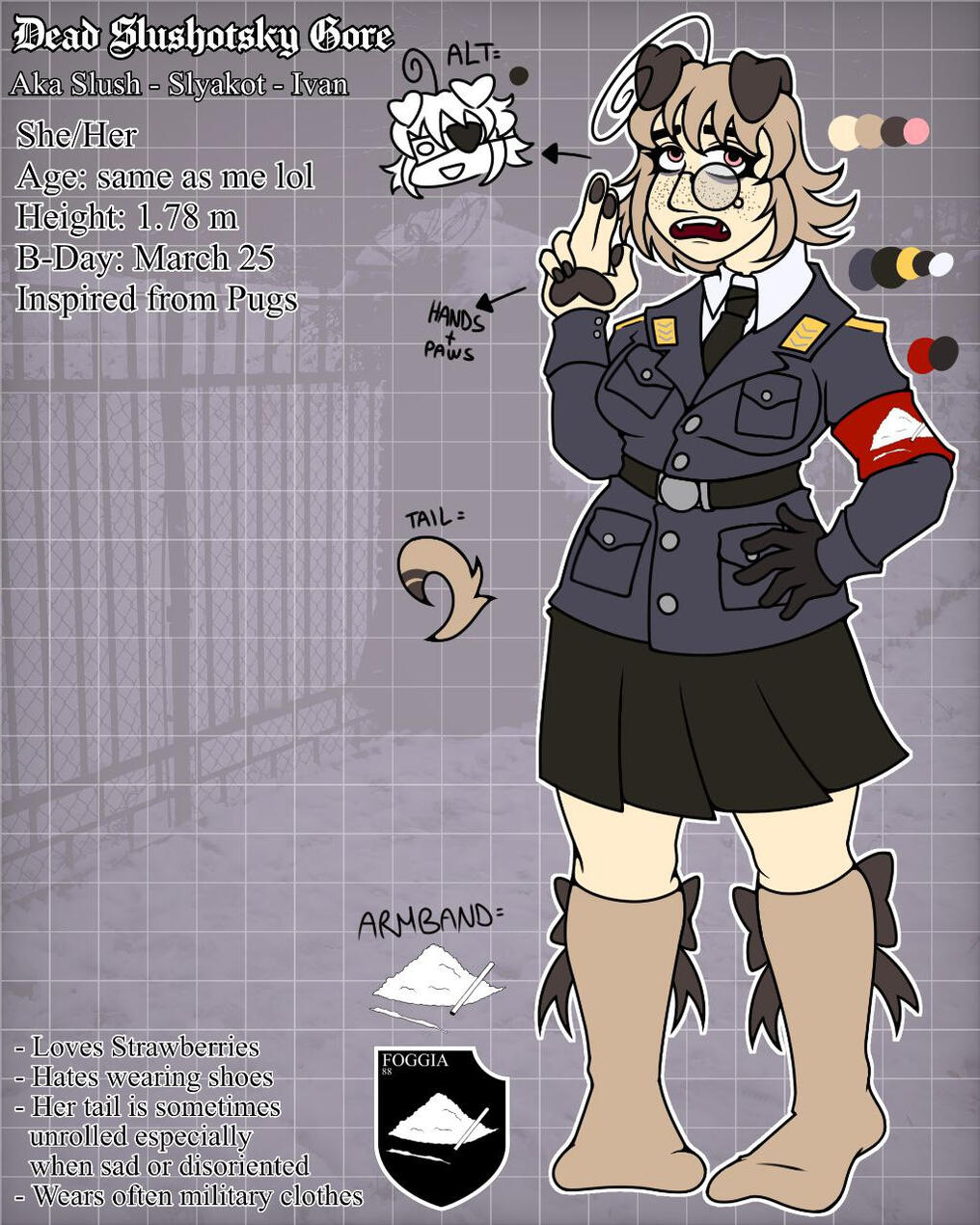 This is the character I use to represent myself, she represents the fact that I LOVE pugs. She hasn't a specific lore (because I'm a very indecisive person), but she's always a sort of mutation and not something totally human.PS: The luftwaffe uniform is made from an inside joke